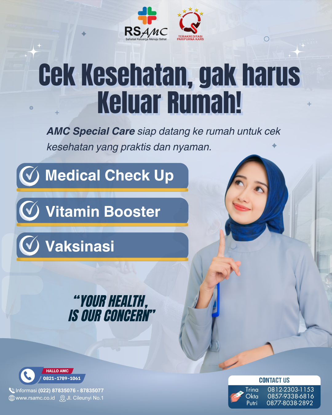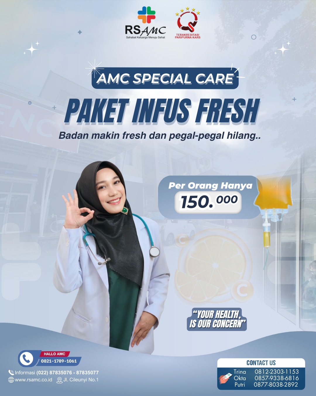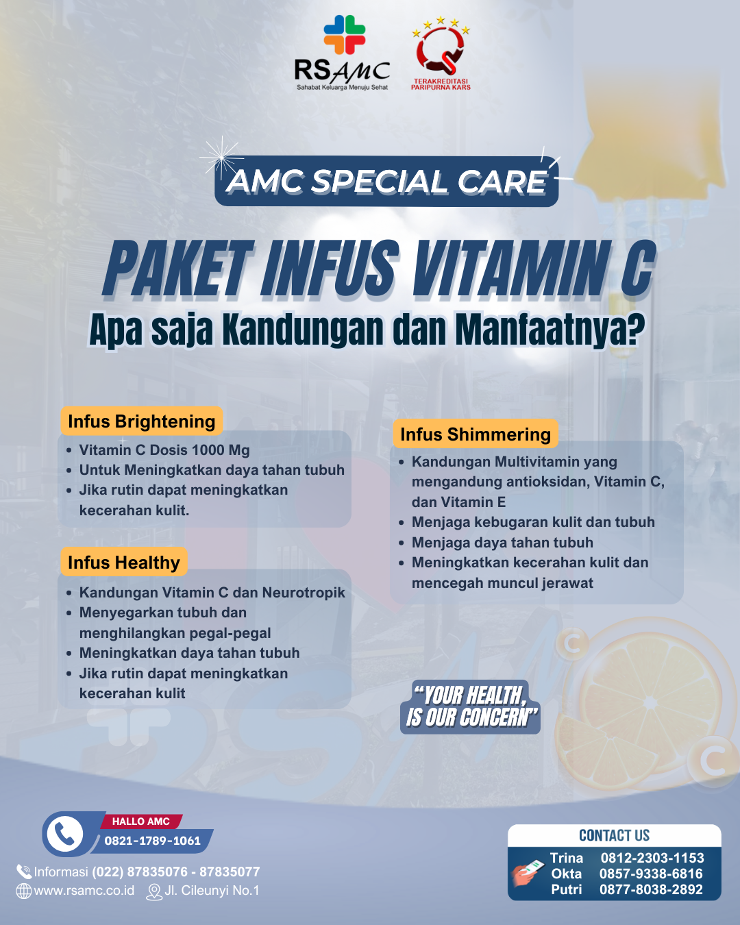 “Ucapan terimakasih kepada seluruh Staff dan Direksi RS AMC yang telah memberikan pelayanan yang menurut saya baik sekali dari mulai OB, Security, Bimbingan rohani, Suster ramah yg tiada lelah melayani keluhan kami dengan sigap dan cepat tanggap. Dan kami memberikan apresiasi yang sangat tinggi kepada Manajemen RS AMC atas pelayanan yang baik ini."
